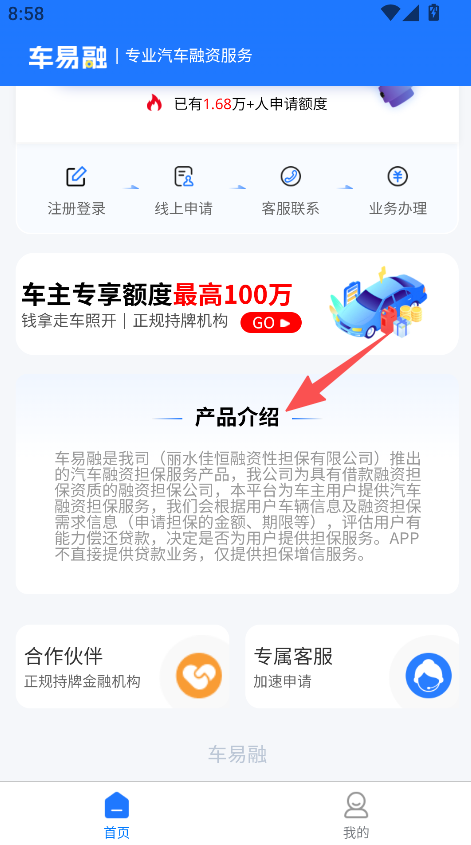 2、返回首页,浏览产品介绍,了解汽车融资担保服务详情。