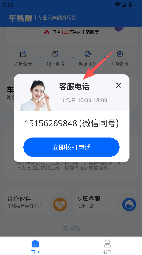 3、实现客服咨询功能,提供客服电话,车主可咨询融资担保疑问,保障融资过程顺畅,服务体验良好。