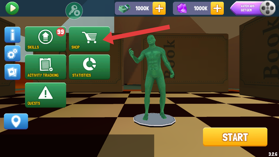 1、点击【SHOP】按钮,进入商店界面,借助无限金币可自由购买武器、道具等。