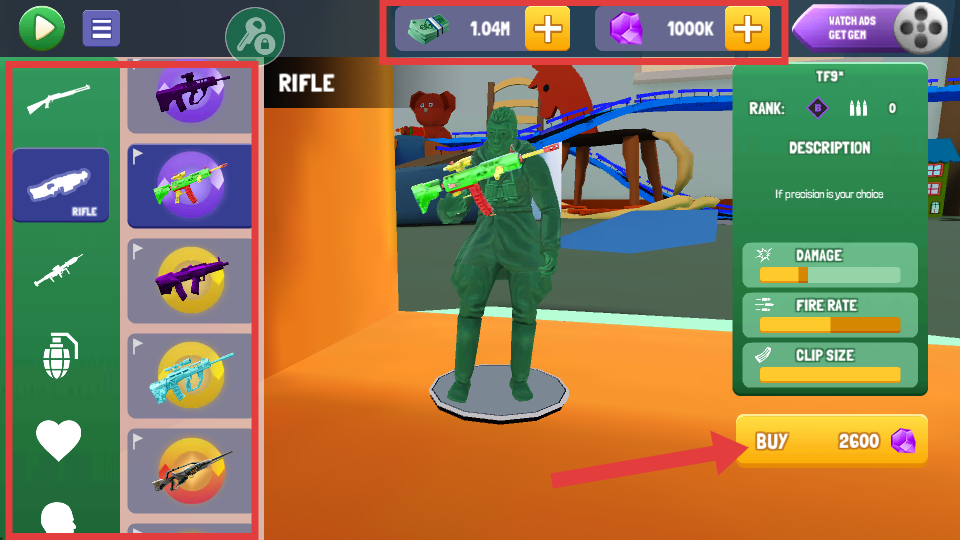 2、在商店中选择心仪的武器(如步枪),点击【BUY】按钮购买,提升战斗能力。
