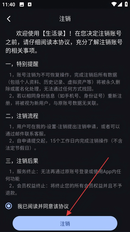 4、在注销协议页面,点击【注销】按钮,完成账号注销操作。