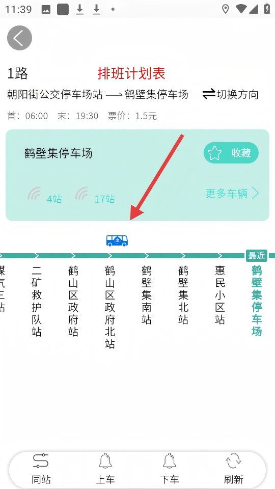 4、查看【1路】公交排班计划表,可了解首末班车时间、票价,还能查看公交实时位置及站点分布,方便掌握乘车时间。