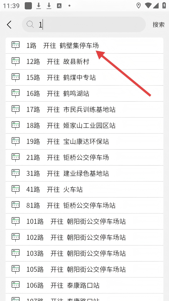 3、在搜索栏输入线路号,如【1】,即可查看对应线路(如1路开往鹤壁集停车场),方便快速找到目标公交路线。