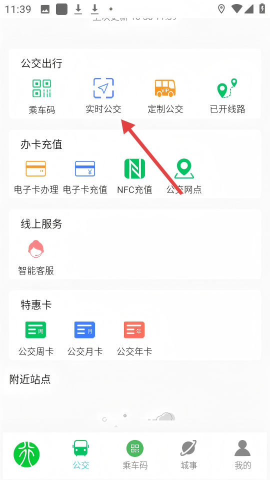 1、点击【实时公交】选项,可进入实时公交查询界面,进一步查询公交实时信息等服务。