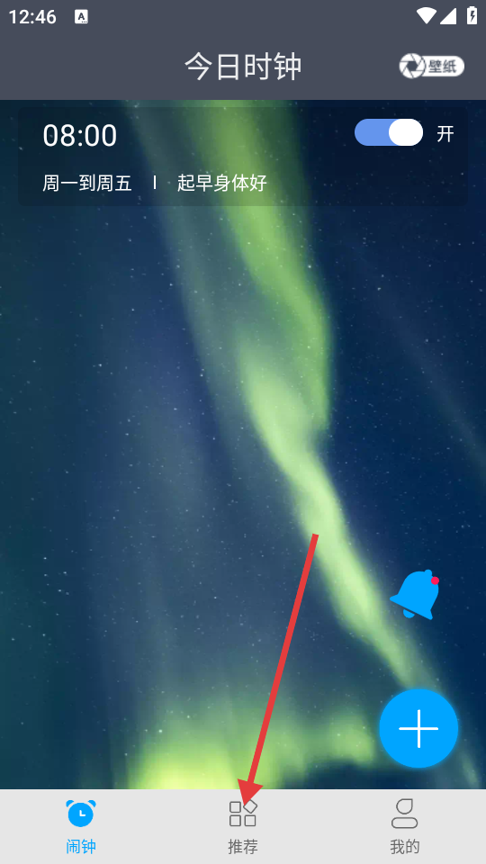 1、在今日时钟页面,点击底部【推荐】选项,进入工具页面。