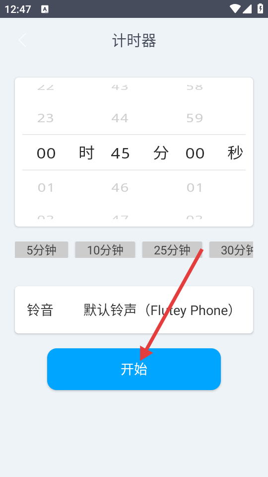 3、在计时器设置页面,设置好时间和铃音后,点击【开始】按钮,启动计时器。