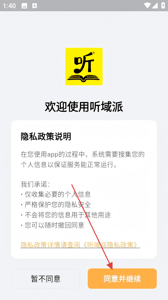 1、进入听域派APP,在隐私政策弹窗中点击【同意并继续】,进入课程页面。
