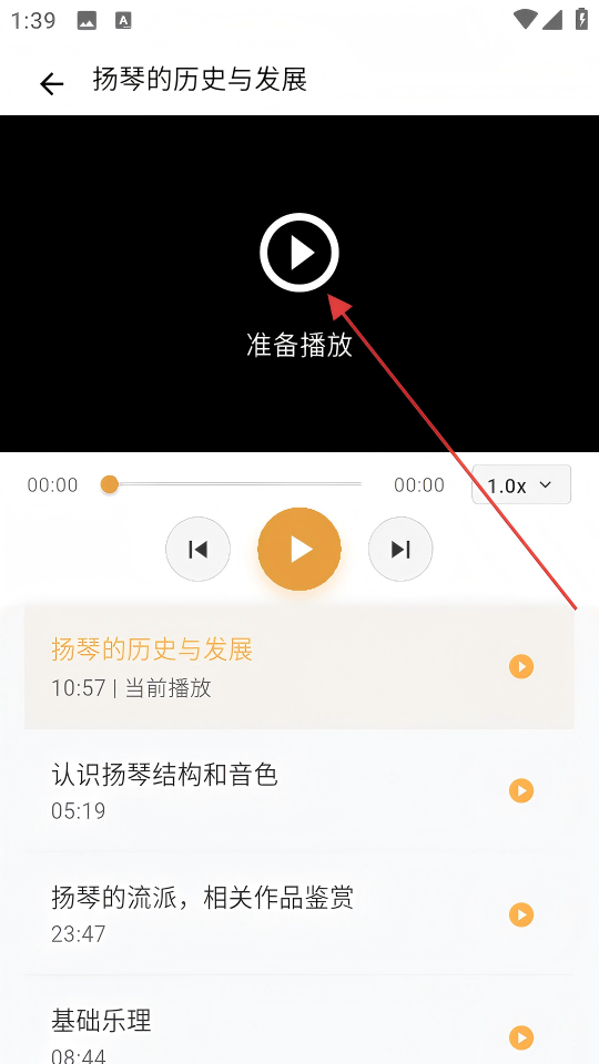 4、在课程播放页面,点击播放按钮,开始学习【扬琴的历史与发展】课程内容。