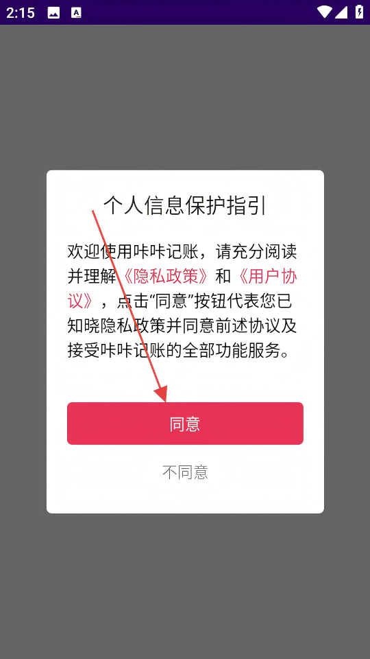 1、打开咔咔记账APP,在【个人信息保护指引】弹窗中点击【同意】,进入明细页面。