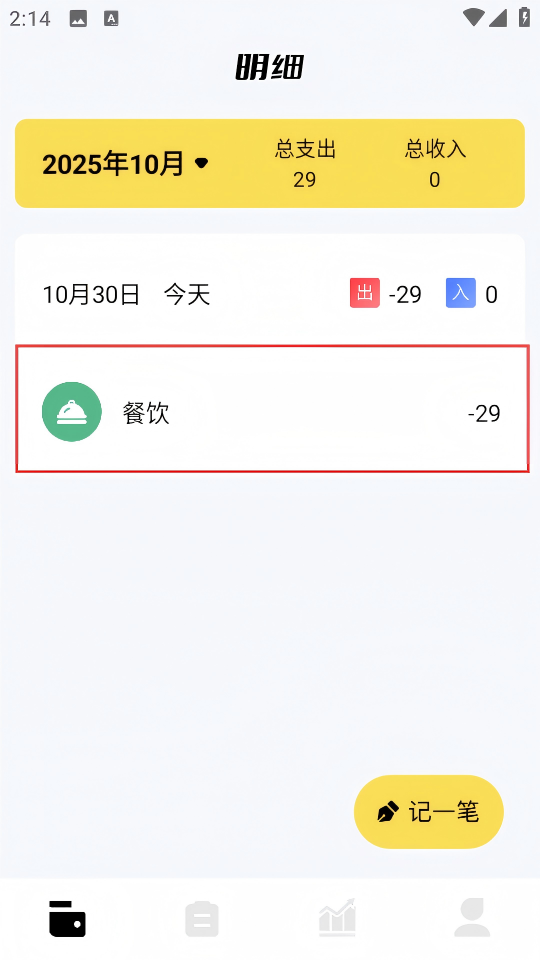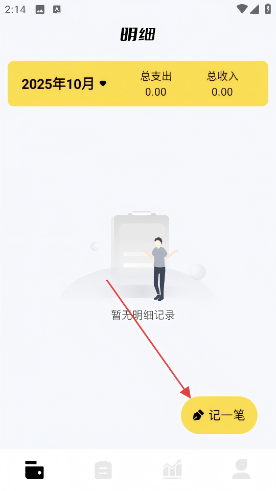 2、在明细页面,点击右下角【记一笔】按钮,进入记账页面。