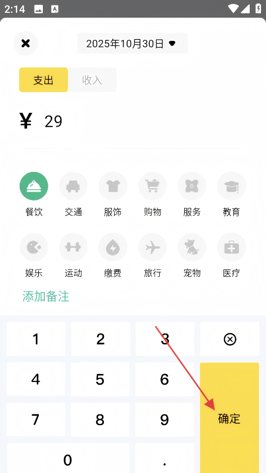 3、在记账页面,选择支出类别、输入金额后点击【确定】,完成记账操作。