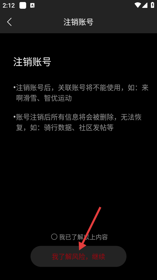 4、在注销账号页面中,勾选“我已了解以上内容”后,点击【我了解风险,继续】按钮,完成账号注销操作。