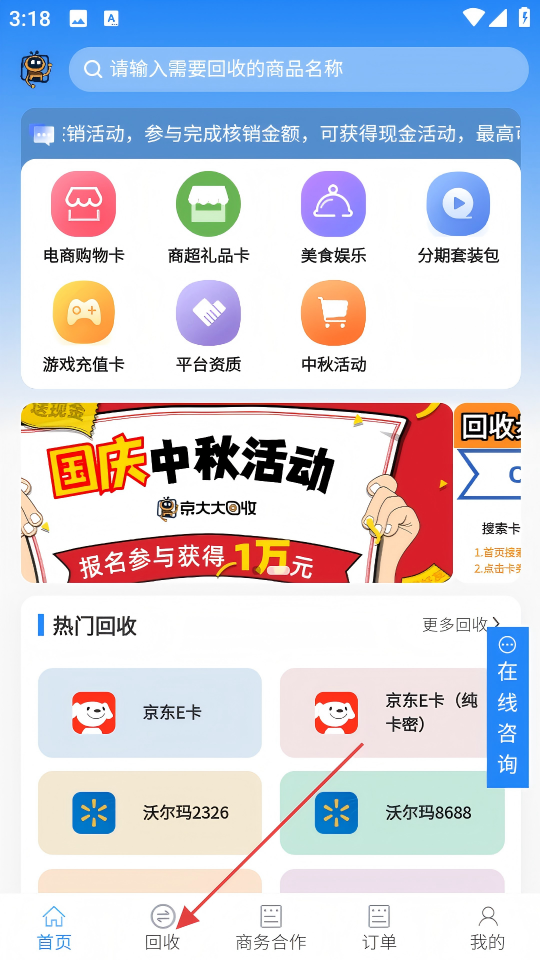 1、进入APP首页,点击底部【回收】按钮,进入回收种类页面。