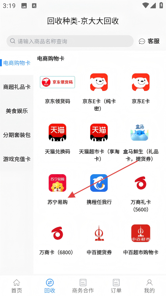 2、在回收种类页面,点击【苏宁易购】选项,进入面值选择页面。