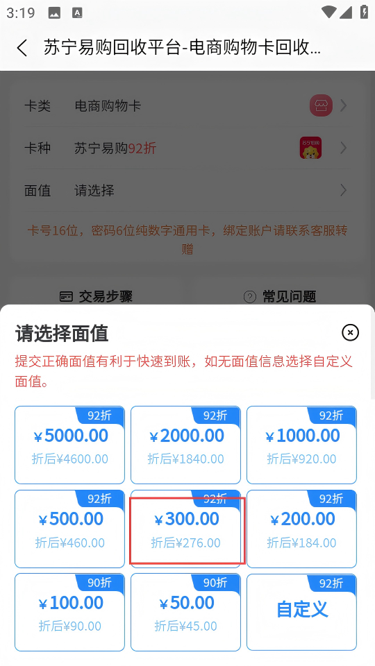 3、在面值选择页面,选择对应的面值,进入提交页面。