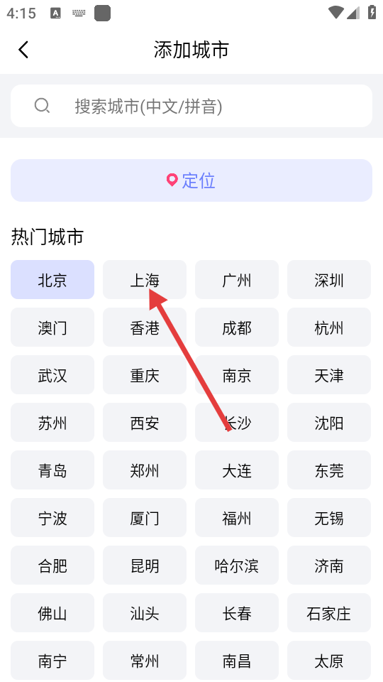 3、在添加城市界面,可通过搜索或点击热门城市如【上海】来选择要添加的城市。