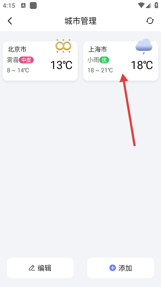 4、添加完成后,在城市管理页面可查看已添加城市如【上海市】的天气信息。