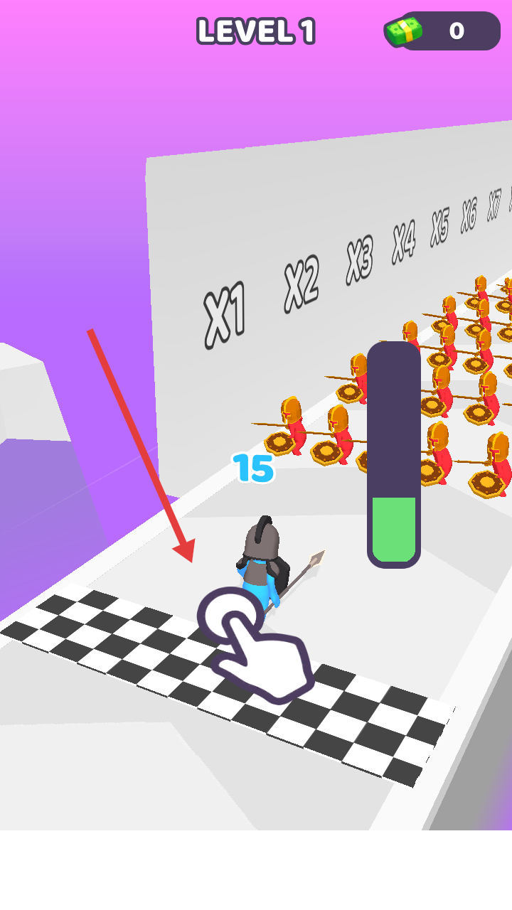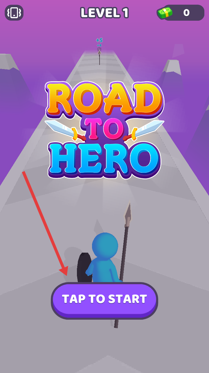 1、点击TAPTOSTART开始,在赛道场景中操控蓝色小人,开启收集武器、提升战力的挑战。