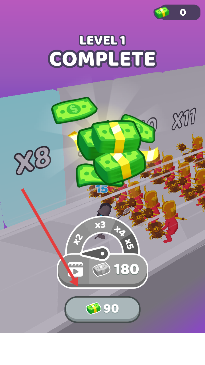 2、操控蓝色小人移动,收集赛道上的武器,提升自身战力,向关卡深处推进。