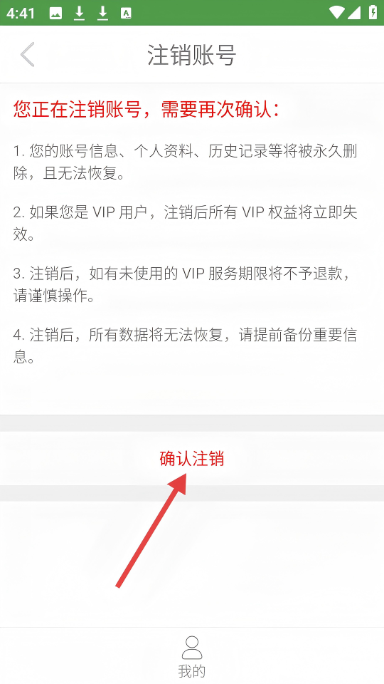 4、在注销账号页面确认【您正在注销账号,需要再次确认】的内容后,点击【确认注销】即可完成账号注销。