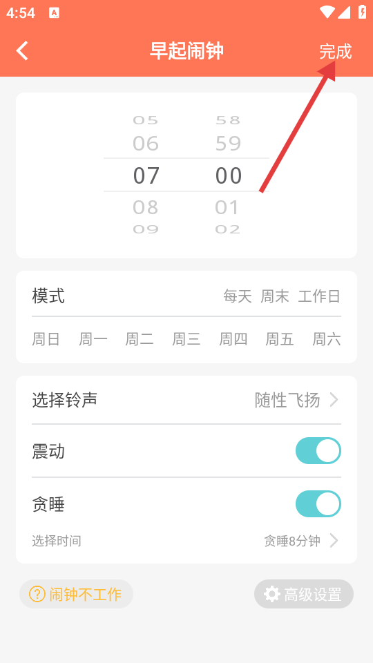 4、在早起闹钟设置界面设置时间、模式、铃声等信息后,点击【完成】按钮,完成早起闹钟设置。