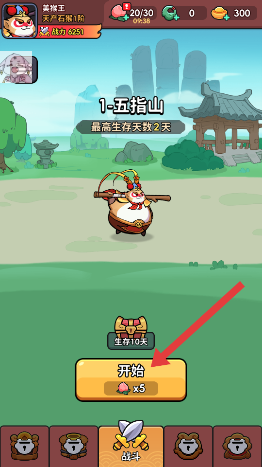 1、在【1-五指山】场景,点击【开始】按钮消耗【仙桃x5】进入关卡,开启生存挑战。