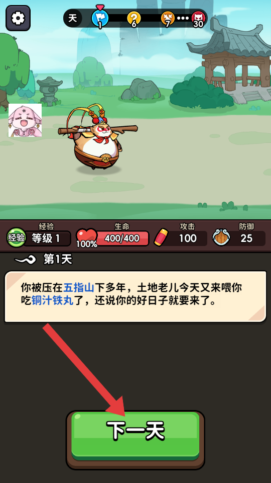 2、第1天推进剧情时,点击【下一天】,角色【等级1】初始属性需逐步发展,解锁后续内容。