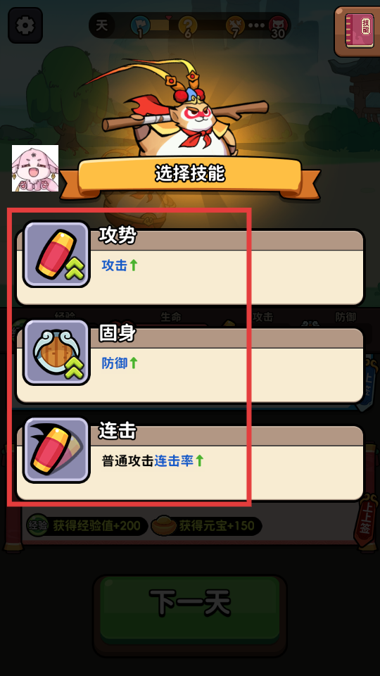 3、技能选择界面可从【攻势】【固身】【连击】中选其一,不同技能分别提升攻击、防御或连击率,助力战斗。