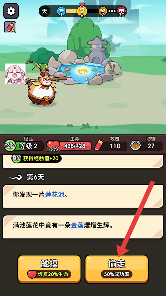 4、第6天发现莲花池金莲时,可选择【触摸】恢复20%生命或【偷走】(50%成功率),根据自身状态抉择以提升生存能力。