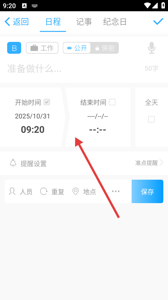 3、在日程添加界面,填写日程内容、设置开始时间和结束时间等信息。