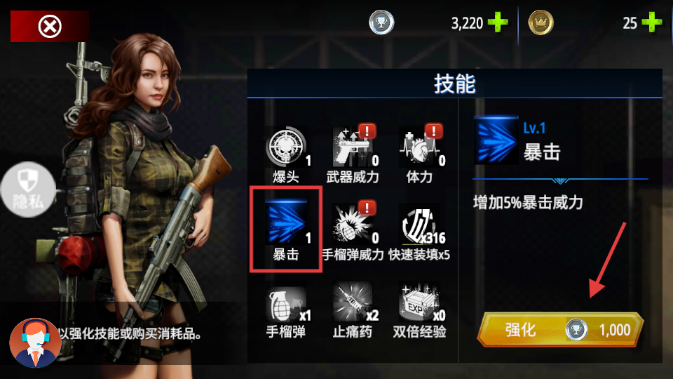 1、在技能界面选【暴击】技能,点击【强化】,耗【1000】奖杯提升暴击威力,增强对僵尸伤害。