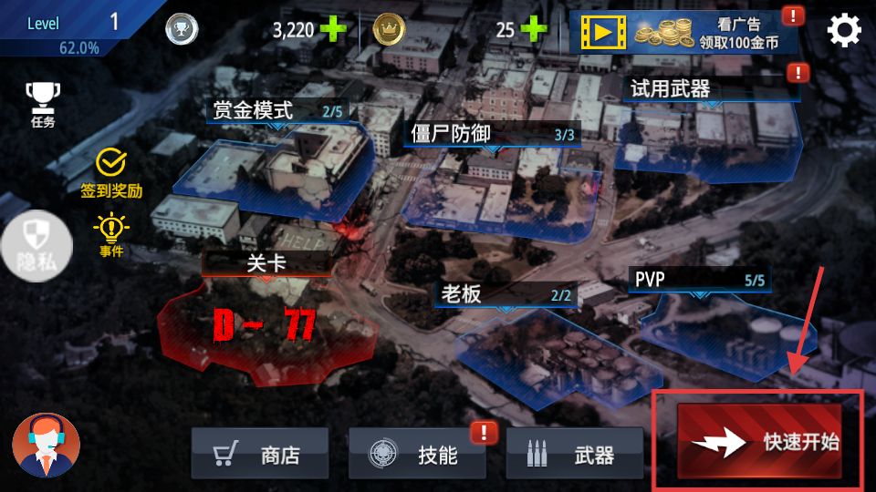 2、进入地图界面,点【快速开始】,可进【D-77】关卡,或先选其他模式准备战斗。