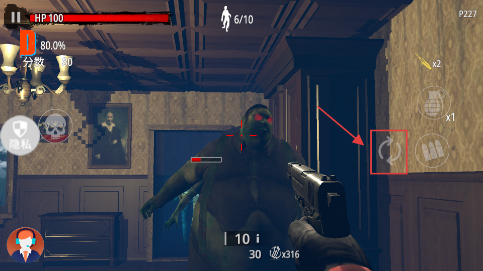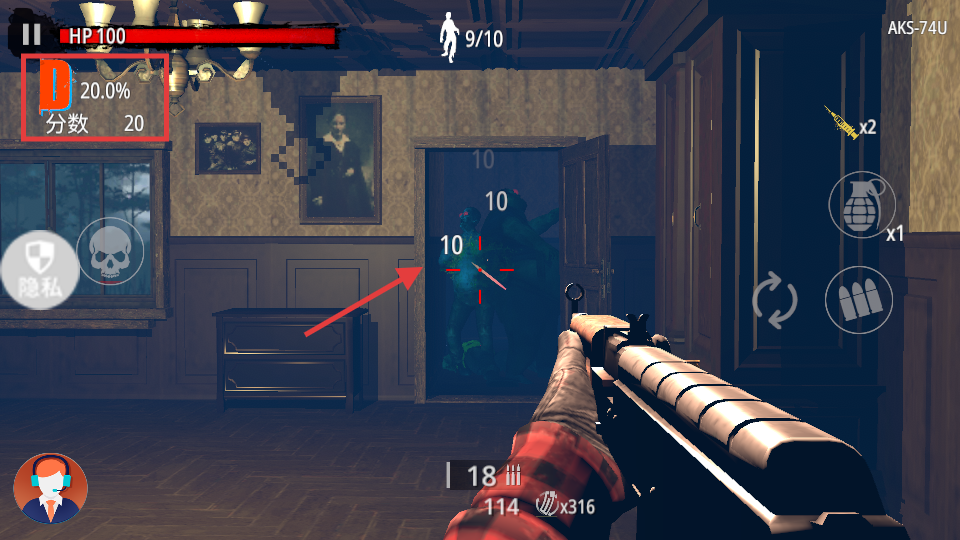 3、战斗时瞄准僵尸弱点射击,获更高分,关注【HP】及剩余僵尸数【9/10】,合理分配弹药。