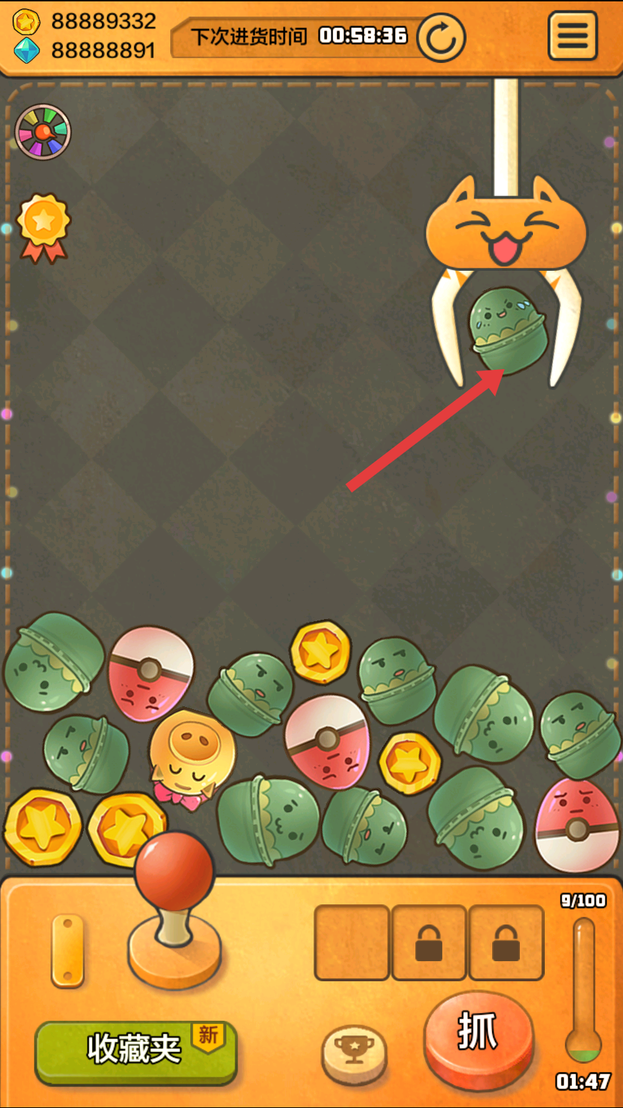 2、进入抓取界面后,使用摇杆移动爪子到目标物品上方,按红色箭头指示抓取【绿色带表情物品】。
