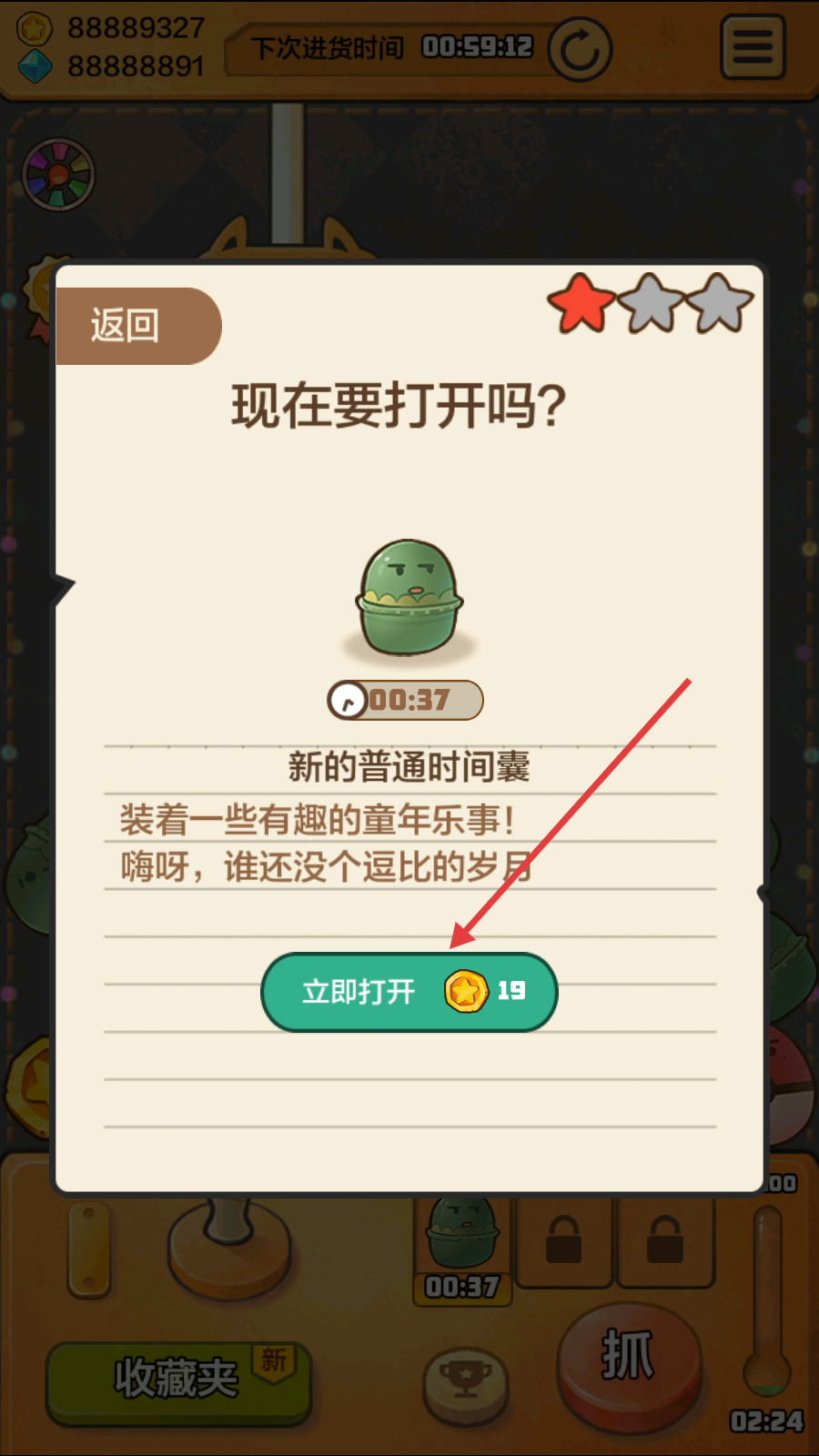 3、抓取到【绿色带表情物品】后,弹出提示框,点击【立即打开】消耗19金币开启。