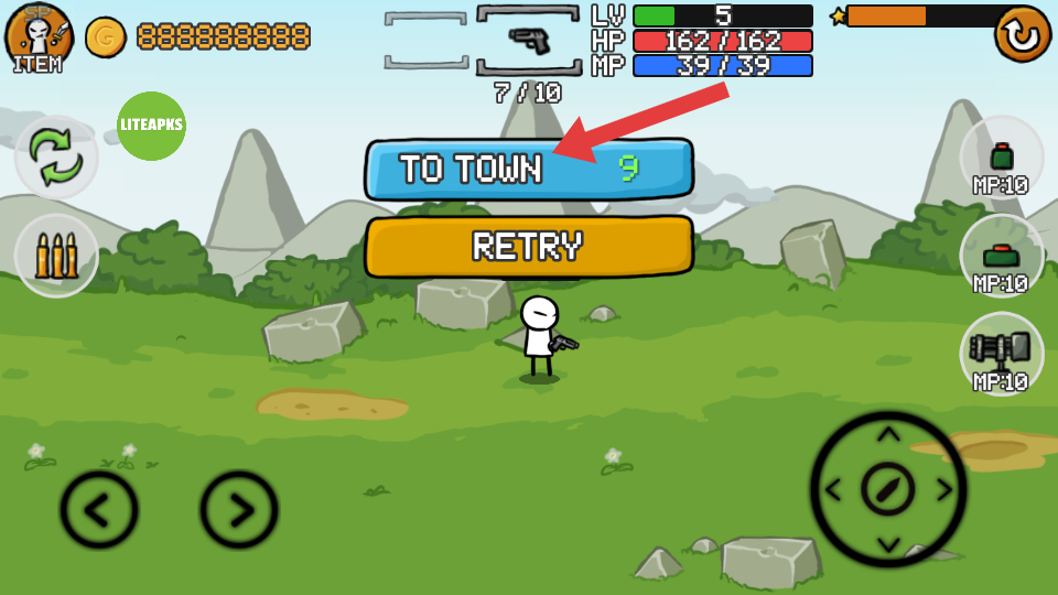 4、关卡阶段完成后,点击【TO-TOWN】按钮前往城镇,可在城镇中利用无限金币购买强力装备、解锁技能。