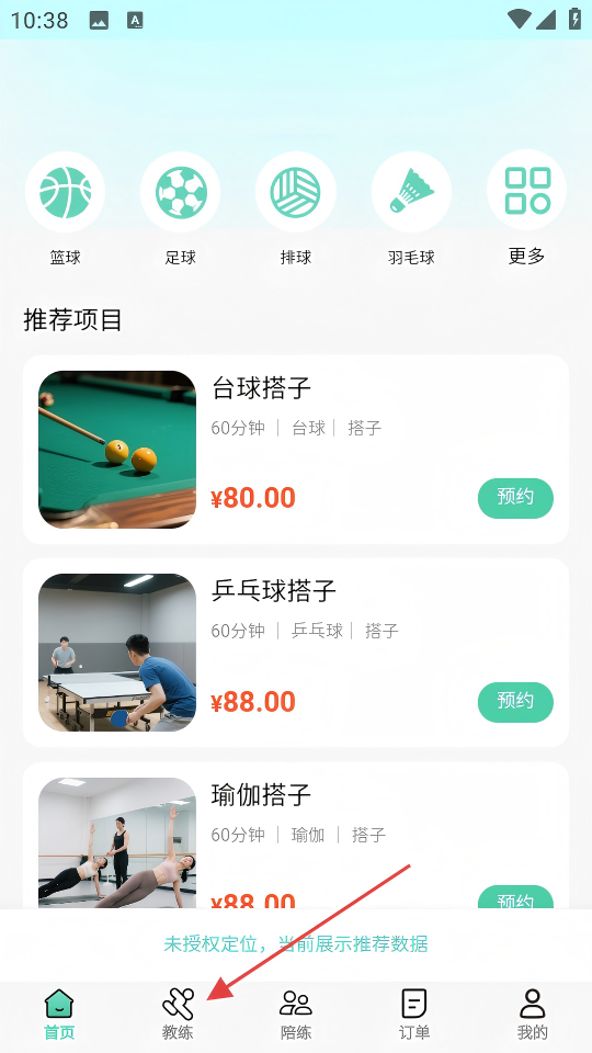 1、进入APP首页,点击底部【教练】按钮,进入教练列表页面。