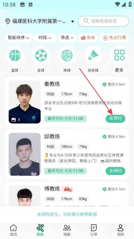 2、在教练列表页面,选择教练,点击【去预约】,进入教练详情页面。