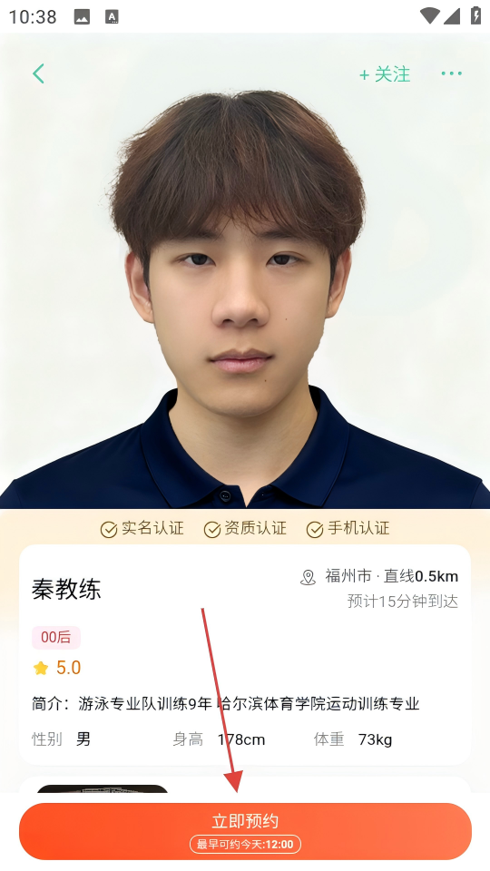 3、在教练详情页面,点击【立即预约】按钮,进入服务项目选择页面。