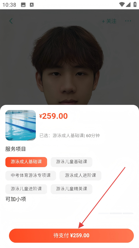 4、在服务项目选择页面,选好项目后点击【待支付】按钮,完成教练预约的支付操作。