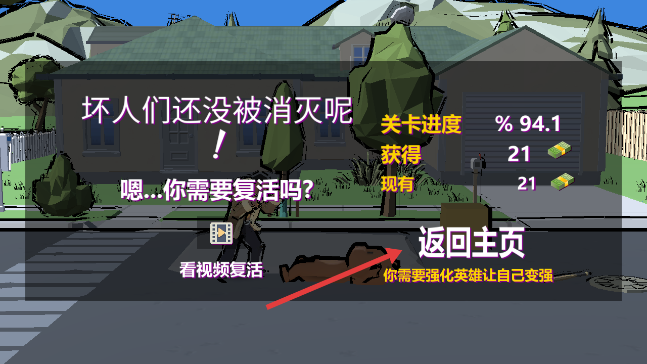 4、若战斗失败,可选择看视频复活,继续战斗或返回主页,返回主页后强化玩玩熊属性以提升战力。