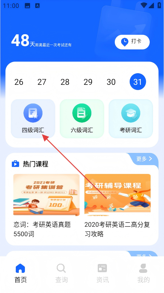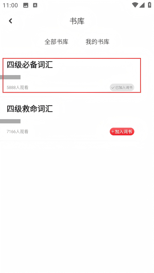 1、进入APP首页,点击【四级词汇】选项,进入书库页面。
