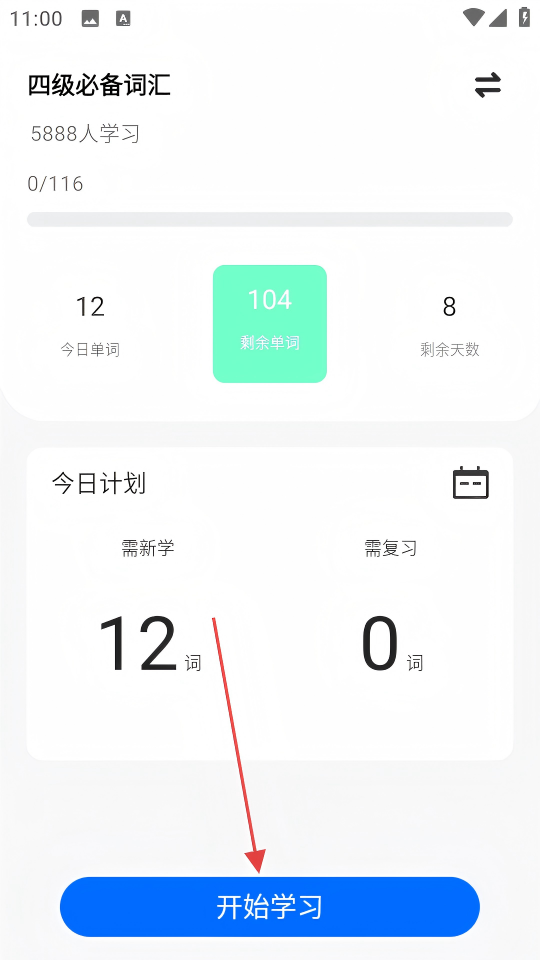 3、在学习计划页面,点击【开始学习】按钮,进入词汇学习页面。