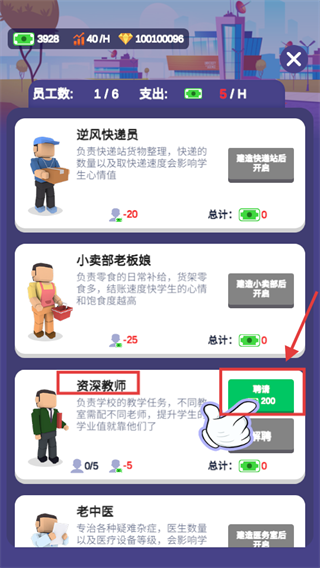 1、资金足够时,点击【资深教师】的【聘请】按钮,花费【200】金钱聘请,提升学生学业。