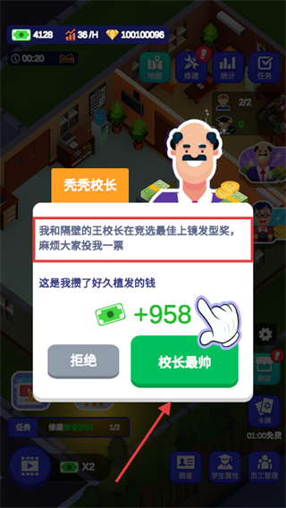 2、校长请求投票时,点击【校长最帅】,获【958】金钱,用于校园建设。