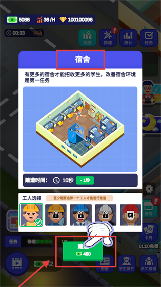 3、建造宿舍选工人后,点【建造】花【480】金钱,10秒完成,招收更多学生。