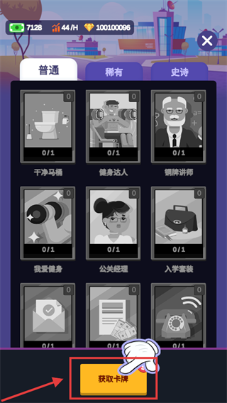 4、点击【获取卡牌】,可得不同品质卡牌,升级设施或增强员工,助校园发展。