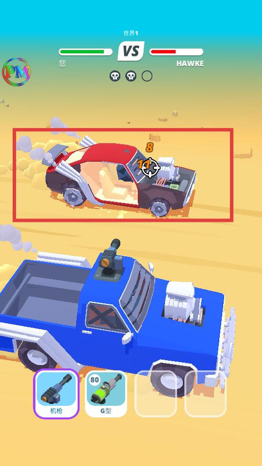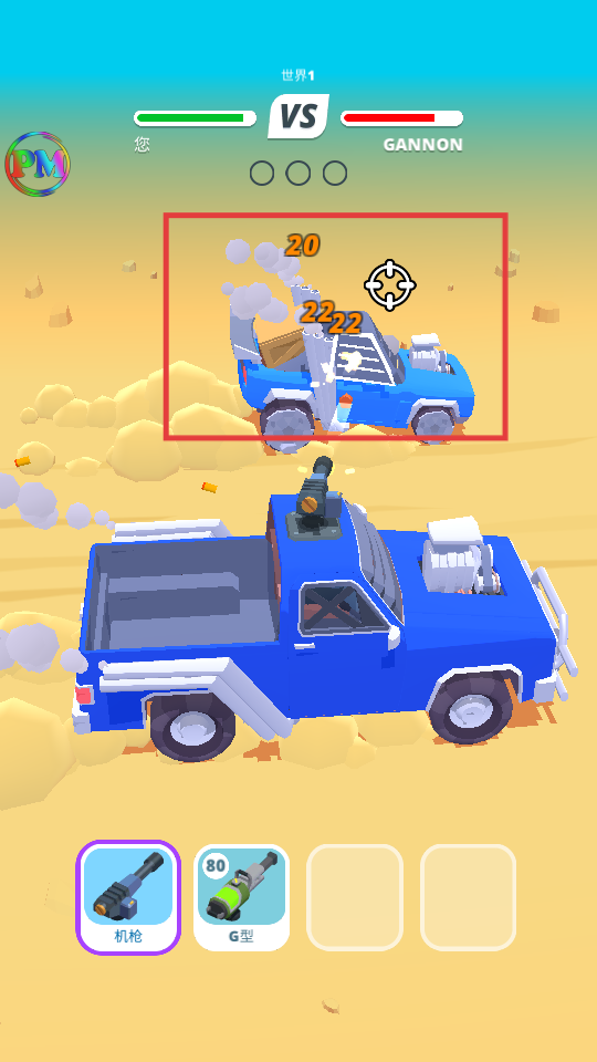 2、战斗中【长按屏幕】瞄准敌方蓝色车辆,利用机枪等武器射击,快速削减其血量以获得胜利。