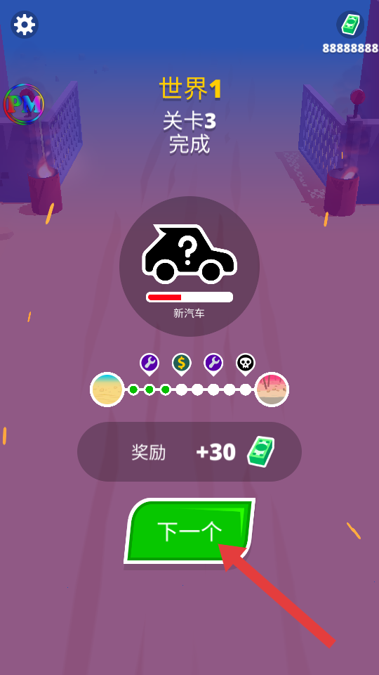 4、关卡完成后,点击【下一个】按钮进入下一关,可获得金币奖励并解锁新汽车。