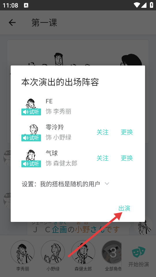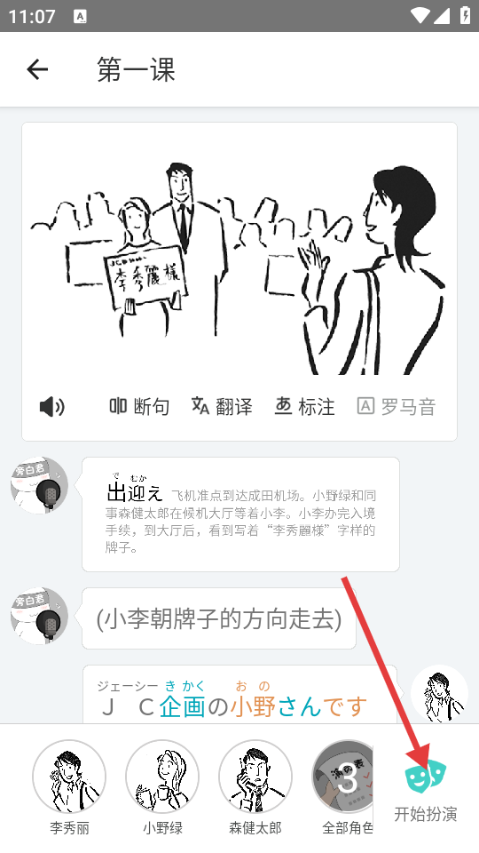 2、在第一课学习页面,点击右下角“开始扮演”按钮,进入演出阵容选择页面。